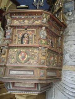 Saarnastuoli lahjoitettiin Oldsbölen kartanosta vuonna 1655 ja on turkulaisen puunleikkaaja Måns Larssonin työnjälkeä.