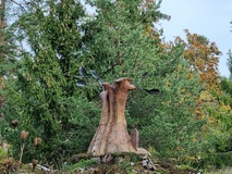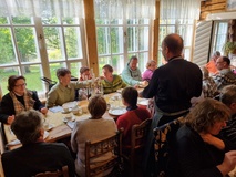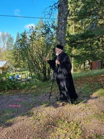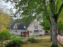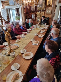Menimme Villa Dannebrogiin nauttimaan herkullisen lounaan, Pozarskyn kyljykset, (vaalean linnun jauhetusta lihasta tehdyt pihvit), muhennettua perunaa sekä Pokrovan omenatorttu ja kahvi, tarjolla oli myös puutarhan mehua ja leipää. Ruokailun jälkeen vierailimme pienessä putiikissa, jossa on veljestön itsensä keräämiä ja säilömiä, kuivattuja ja valmistettuja luonnontuotteita. Lehmuksenkukkatee, sienisäilykkeet, erilaiset mehut ja hillot kuuluvat valikoimaan.