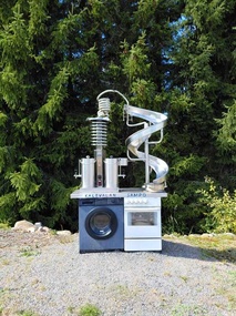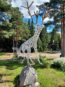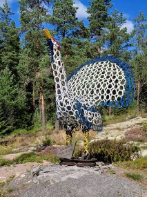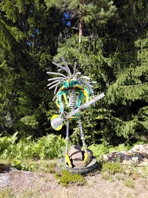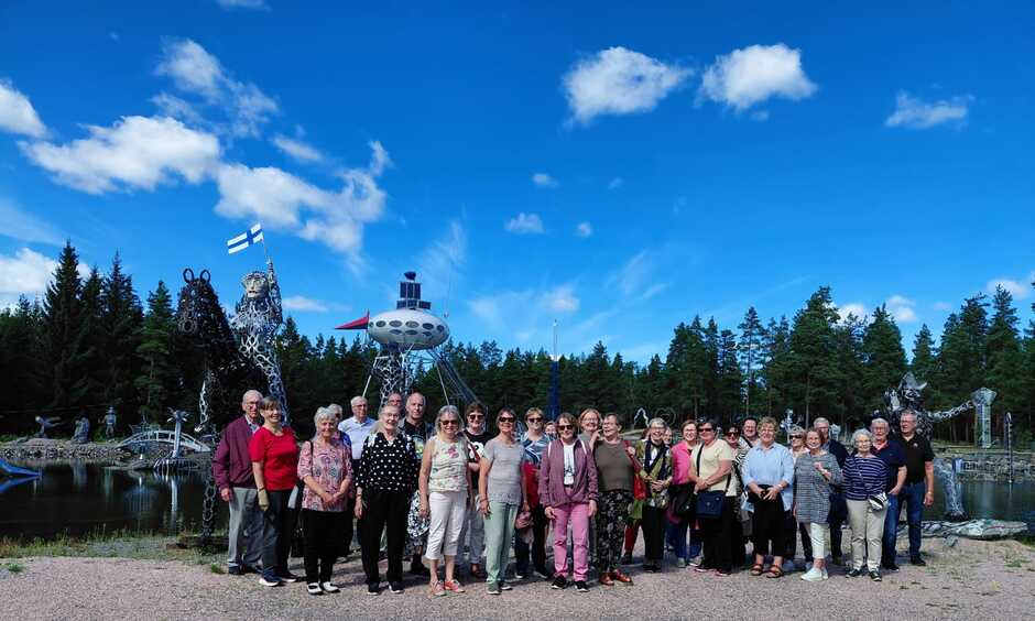 Vihdoin saavuimme ensimmäiseen kohteeseen, Enkelipuistoon Pöytyälle. Isäntä Kyösti Iitti toivotti meidät lämpimästi tervetulleeksi. Puistossa on 120 patsasta, ja monet niistä on hitsattu hevosenkengistä. Kyösti esitteli meille patsaita ja niihin liittyviä tarinoita. Hän välillä lauloi ja houkutteli meitä yhteislauluun. Harvoin tapaa ihmisen, joka omalla olemuksellaan ja energisyydellään luo niin iloisen ja positiivisen ilmapiirin. Siinä Kyösti onnistui todella hyvin.