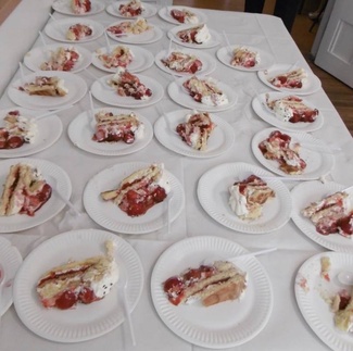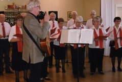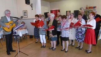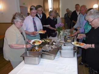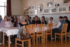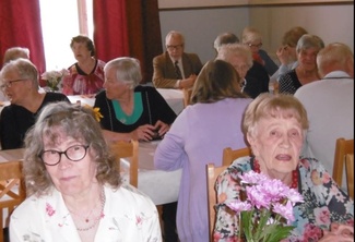 Kevätjuhlien tärkeä asia oli ruoka. Välillä pihvit, salaatit ja kahvikin loppuivat mutta nopeasti niitä saatiin lisää. Kirkkoherra Esa Lahtinen toi tilaisuuteen seurakunnan tervehdyksen ja tietysti lauluryhmä esiintyi. (teksti M Immonen)