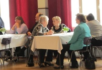 Kevätjuhlien tärkeä asia oli ruoka. Välillä pihvit, salaatit ja kahvikin loppuivat mutta nopeasti niitä saatiin lisää. Kirkkoherra Esa Lahtinen toi tilaisuuteen seurakunnan tervehdyksen ja tietysti lauluryhmä esiintyi. (teksti M Immonen)